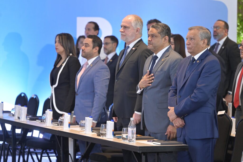 El presidente ejecutivo de Banreservas, doctor Leonardo Aguilera, en la apertura del Tercer Congreso Contra el Lavado de Activos y el Financiamiento del Terrorismo, acompañado, desde la izquierda, por el coronel (ERD) Jaime Pérez Díaz, director de Investigaciones Financieras de la Dirección Nacional de Control de Drogas; magistrado Wilson Manuel Camacho, director general de Persecución del Ministerio Público; Alejandro Fernández W., superintendente de Bancos; Heiromy Casto, vicepresidente de Cumplimiento de Banreservas; y Bienvenido Roberts Carrero, director técnico de la Unidad de Análisis Financiero (UAF).