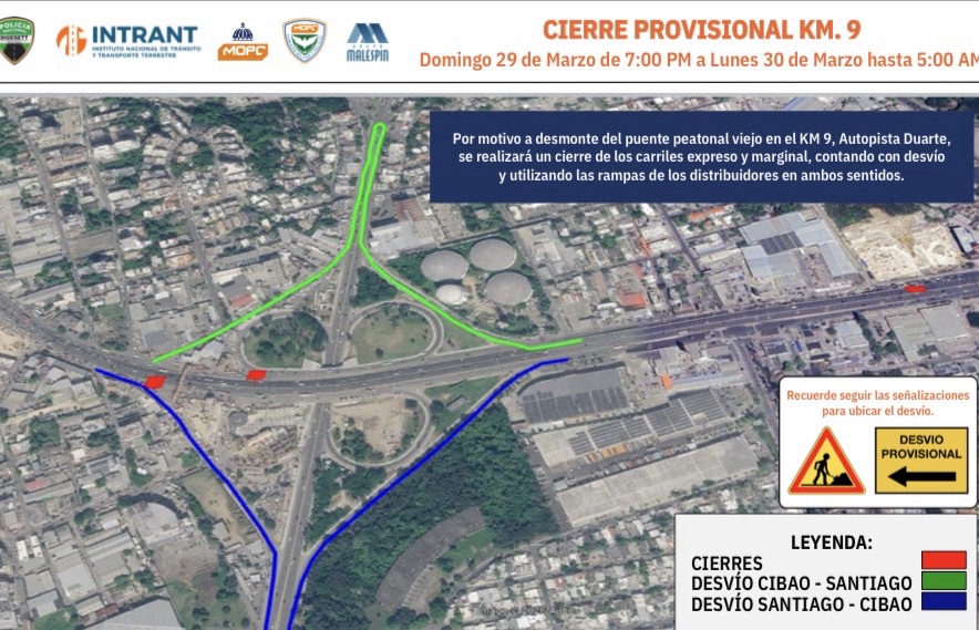 Santo Domingo. — El Ministerio de Obras Públicas y Comunicaciones (MOPC) informó que este domingo en horario nocturno se realizará el retiro del viejo puente peatonal en el Kilómetro 9 de la autopista Duarte, lo que implicará un cierre temporal de la vía y la aplicación de desvíos en la zona.