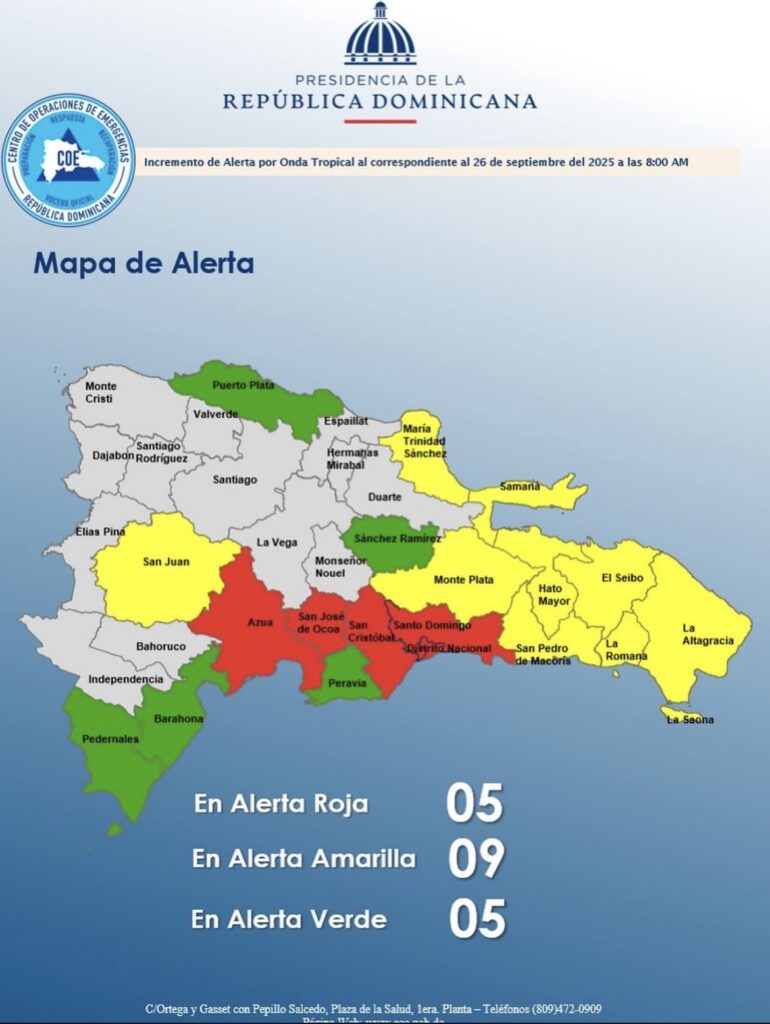 Además de Santo Domingo, otras provincias se encuentran en alerta amarilla y verde, lo que confirma la magnitud del fenómeno meteorológico que afecta al país.