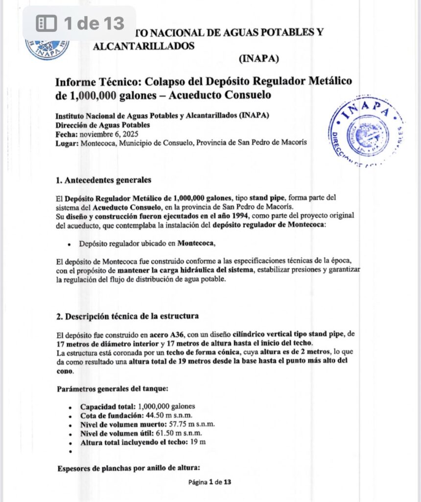 El Instituto Nacional de Aguas Potables y Alcantarillados (INAPA) informó este jueves que el depósito regulador que colapsó en el municipio de Consuelo, provincia San Pedro de Macorís, fue construido en 1994, con las especificaciones técnicas de la época. Se ha rendido un informe detallado al director ejecutivo del INAPA, Wellington Arnaud donde se explican las causas del colapso.