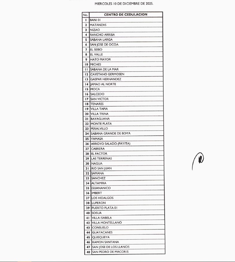 Santo Domingo. – La Junta Central Electoral (JCE) informa a la ciudadanía que serán suspendidos temporalmente los servicios en 48 centros de cedulación a nivel nacional durante los días 9 y 10 de diciembre de 2025 por trabajos técnicos.
