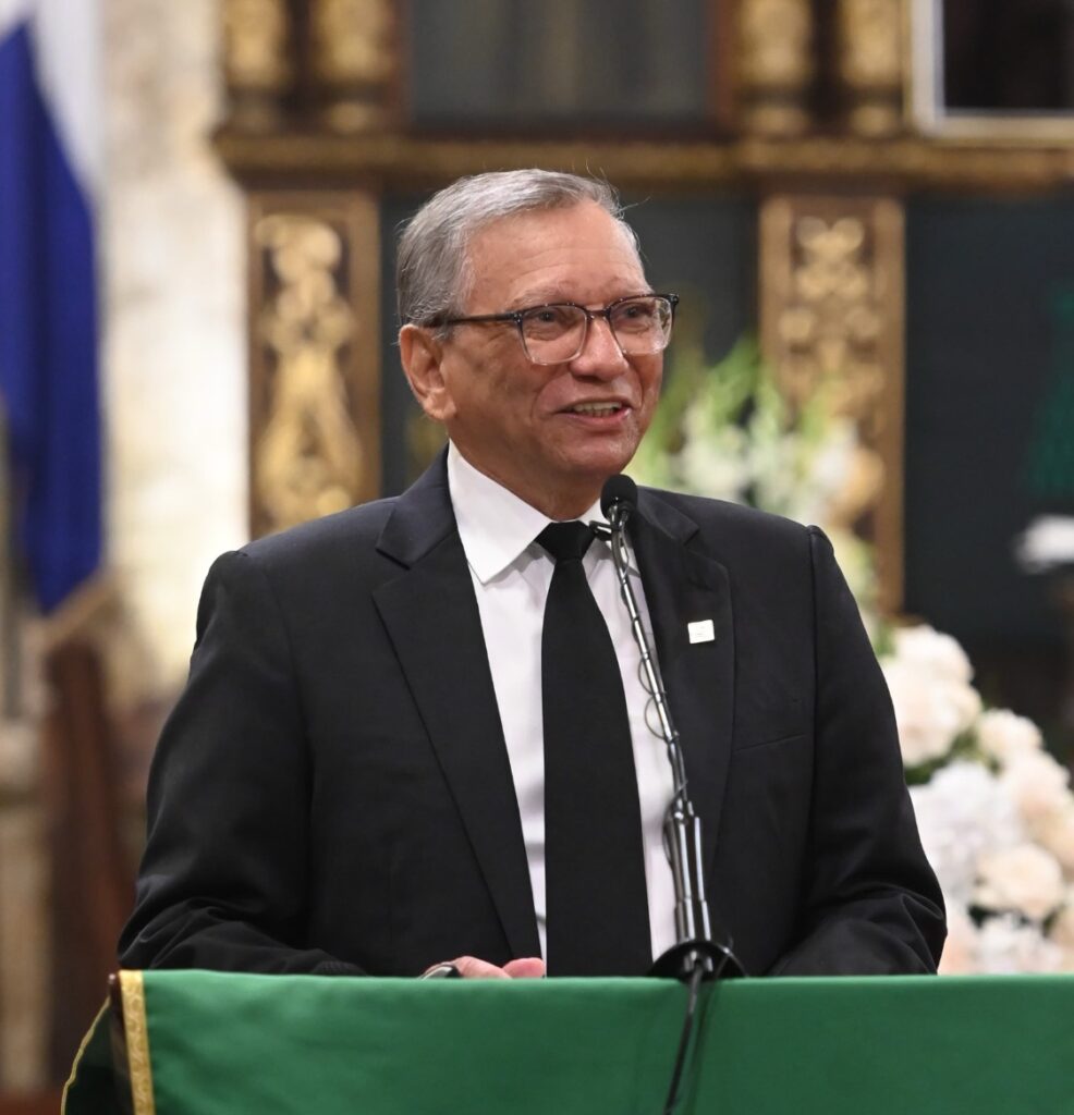 El presidente ejecutivo de Banreservas, doctor Leonardo Aguilera, en la misa celebrada en la Catedral de Santo Domingo, acompañado desde la izquierda por Ysidro García, vicepresidente ejecutivo senior de Negocios de Banreservas; Christopher Paniagua, presidente ejecutivo del Banco Popular; el general Enrique Armando Aguilera; monseñor Ramón Benito Ángeles, auxiliar emérito de la Arquidiócesis de Santo Domingo; Raquel Arbaje de Abinader, primera dama de la República; Carmen Alicia Quijano de Aguilera, presidenta del Voluntariado Banreservas; y Ana Pou de Castro, vicepresidente ejecutivo senior de Capital Humano, Tecnología y Operaciones de la entidad bancaria.